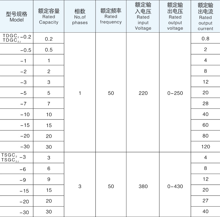 TDGC2、TSGC2、TDGC2J、TSGC2J系列調(diào)壓器具有波形不失真、體積小、重量輕、效率 高、使用方便、性能可靠、能長期運行等特點、達到調(diào)壓、控溫、調(diào)光、功率控制等目的。 廣泛應于化工、冶金、儀器儀表、機電制造、輕工業(yè)、科學實驗、公用設施、家用電器、控溫調(diào)整、 調(diào)光、及功率控制等目的,是種理想的交流調(diào)壓電源。