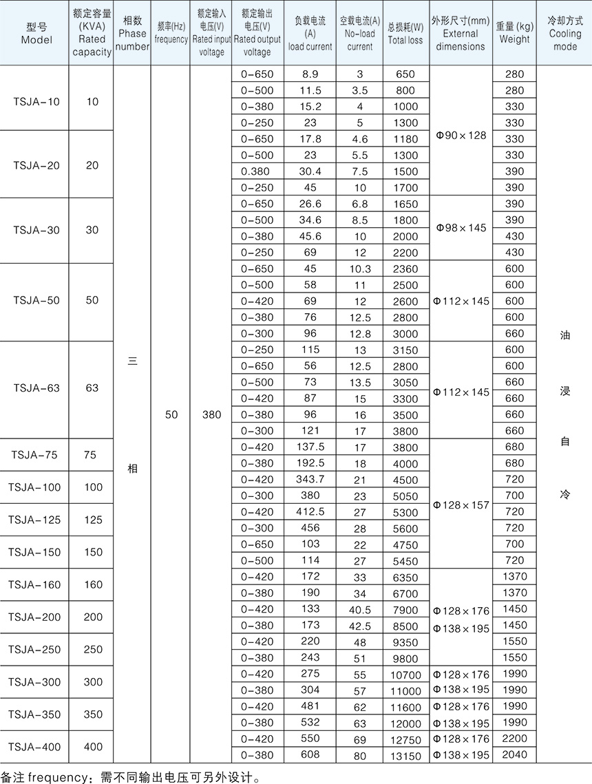 TDJA、TSJA系列單、三相油浸自冷感應調壓器(穩(wěn)壓器)能在帶負荷情況下,無級、平滑、連續(xù)地調節(jié)輸出電壓。主要用于電機電器試 驗、電爐控溫、整流設備配套、發(fā)電機勵磁等,在機械制造、化工、紡織、通訊、軍工等行業(yè) 得到廣泛應用。 TDJA、TSJA型油浸式調壓器采用斜槽新工藝,波形好,達到IEC 標準對電器試驗電源的 要求,該系列產品可平滑、無級地調節(jié)負載電壓,輸出電壓波形畸變小,壽命長、運行可靠, 使用、維護方便、損耗低、過載能力強,具有兩種調壓速度,是電機、變壓器和其他電器 最 理想的可調電源。
