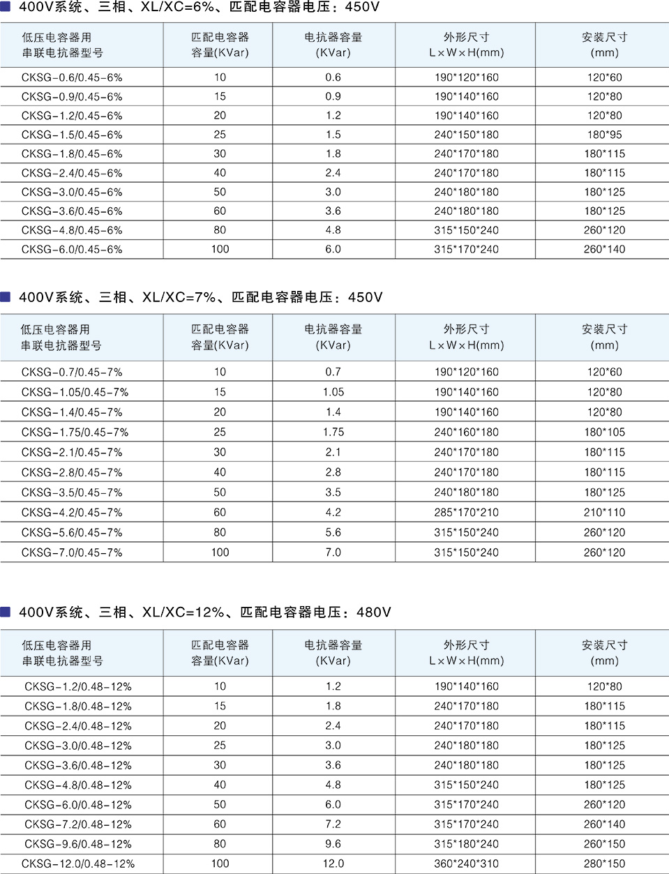 CKDG、CKSG系列低壓串聯(lián)電抗器里面通過的是交流電,它的作用是與功率因數(shù)補(bǔ)償電容器并聯(lián),對穩(wěn)態(tài)性諧波(5、7、11、13次)構(gòu)成串聯(lián)諧振。通常有電抗率 4.5-6%電抗器,對5次諧波通常電抗率為6%屬于高感值電抗器,對3次諧波通常電抗率為12~13%,對2次諧波通常電抗率為26~27%屬于高 感值電抗器。 接入串聯(lián)電抗器,能有效地吸收電網(wǎng)諧波,改善系統(tǒng)的電壓波形,提高系統(tǒng)的功率因數(shù),并能有效地抑制合閘涌流及操作過電壓, 有效地保護(hù)了電容器。
